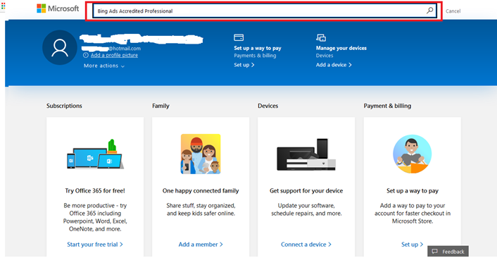 (1)اتجه الى مربع البحث بجوار صورة حسابك الشخصى اعلى يمين الصفحة واكتب Bing Ads Accredited Professional  كما هو موضح بالصورة التالية