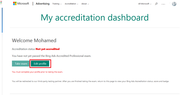 (4)إن كانت بياناتك كاملة على حسابك على موقع ميكروسوفت سوف تتوجه للإختبار مباشرة وإن لم تكن كاملة فسوف تظهر لك الصفحة التالية والتي تفيد بضرورة استكمال بياناتك الشخصية مثل اسمك بالكامل وروابط حساباتك على مواقع التواصل الإجتماعى ورابط موقع الإلكترونى لتصبح مؤهل لاجتياز الاختبار والحصول على الشهادة، فما عليك الا ان تضغط على الرابط المكتوب عليه Edit profile   لاستكمال هذه البيانات كما هو موضح بالصور التالية